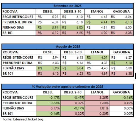 Rodovias: em setembro, Dutra tem a gasolina mais barata e Fernão Dias o diesel mais em conta, aponta Edenred Ticket Log