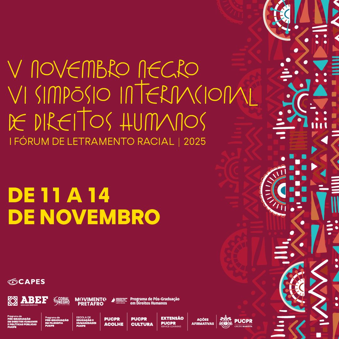 Promovido pelo Programa de Pós-Graduação em Direitos Humanos e Políticas Públicas (PPGDH), pelo Núcleo de Direitos Humanos e pelo Núcleo de Estudos em Educação e Relações Étnicas (NEERE) da PUCPR, o evento tem inscrições gratuitas e é aberto à comunidade. As inscrições podem ser feitas online.