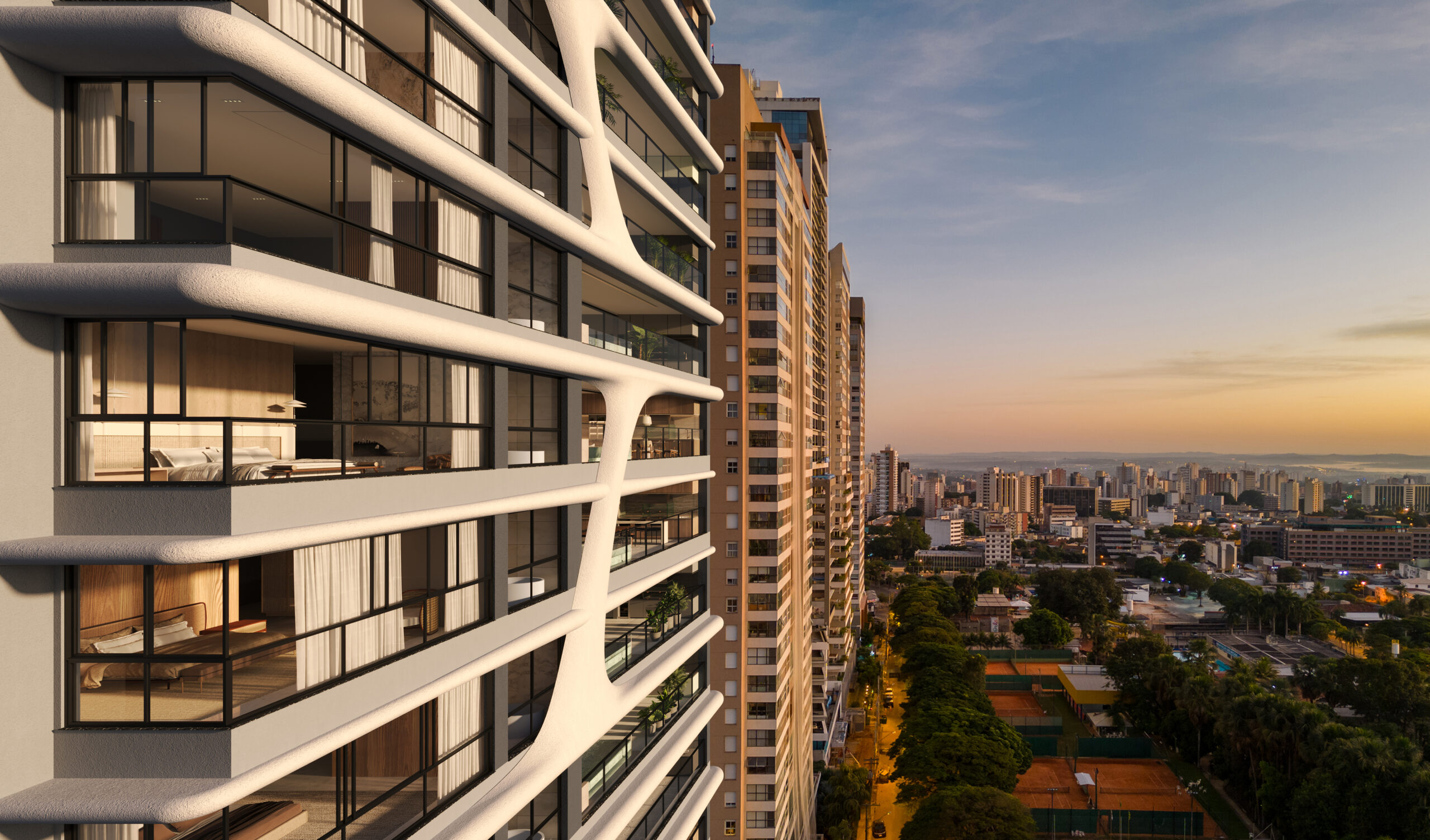 De fato, em Goiânia, o apreço por áreas verdes é um dos principais fatores que tem impulsionado empreendimentos que priorizam a vista livre como um diferencial. É o caso do Auro Consciente, da Consciente Construtora e Incorporadora, localizado no setor Marista, que reúne apenas 24 unidades, todas ocupando o andar inteiro, e que oferecem vista definitiva para o Clube de Engenharia, um dos cenários mais tradicionais e preservados da região. O projeto também recebeu menção honrosa internacional no DNA Paris Design Awards 2024, na categoria Arquitetura Residencial, em reconhecimento à sua excelência arquitetônica. Para a incorporadora, este atributo vai além da estética e do prestígio. “A vista consolidada é um dos diferenciais mais valorizados no mercado de alto padrão. No caso do Auro, ela não apenas garante exclusividade, mas também estabelece uma relação direta com a natureza, algo cada vez mais raro em áreas centrais da cidade”, avalia a diretora de empreendimentos da Consciente, Camila Inácio.